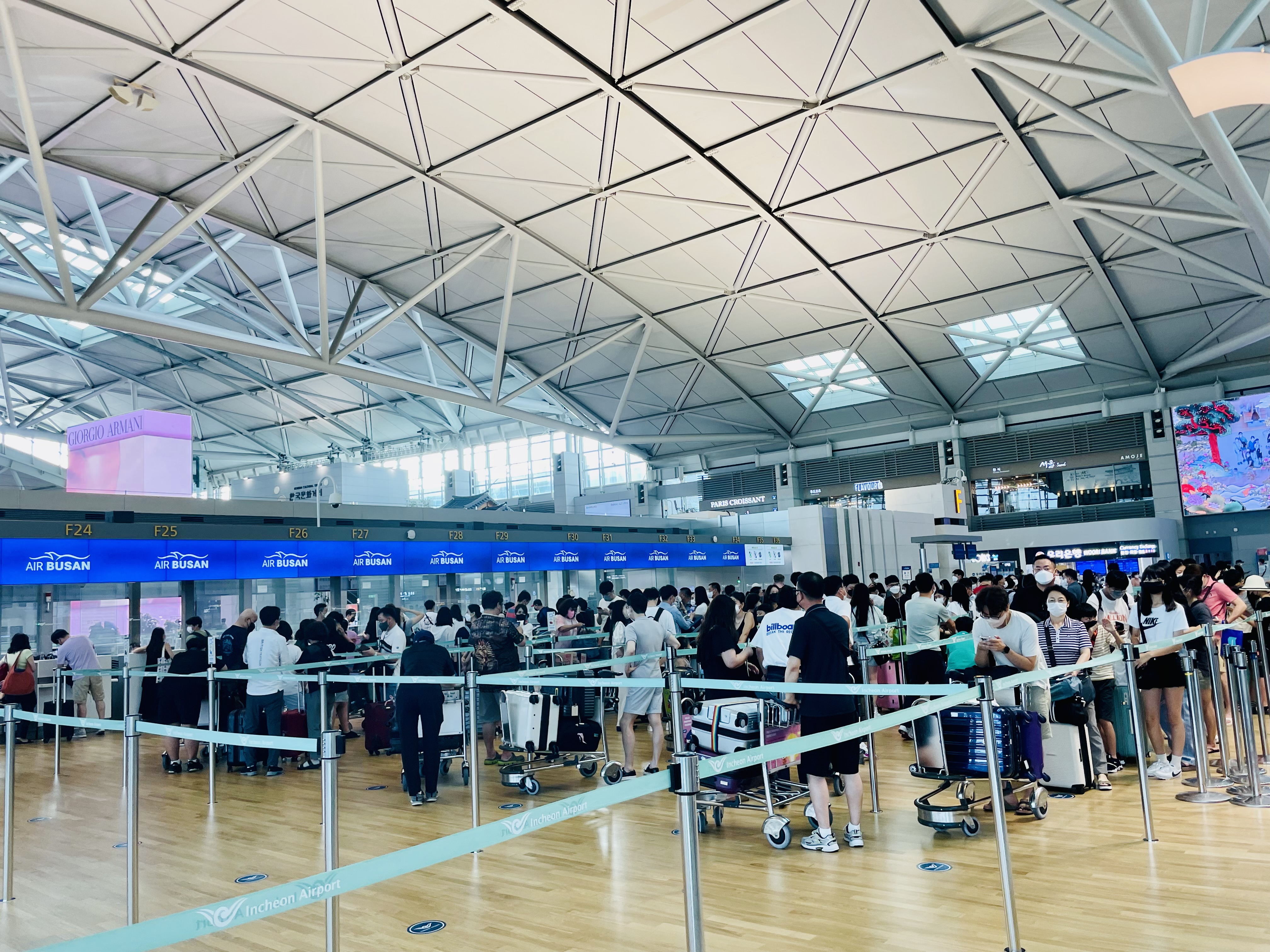 사람 없을 줄 알았는데, 줄이 길어서 당황했다. 오다가 버스 밀렸으면 큰일날 뻔.. 여차저차 출국수속 하고 비행기 기다리는데 보이는 예쁜 무지개 ㅎㅎ 기분이 설렜다! 에어부산 타고 갔는데 기내식 괜찮았다! 뭔가 벌써부터 해외느낌! 면세점들은 문을 닫았다.