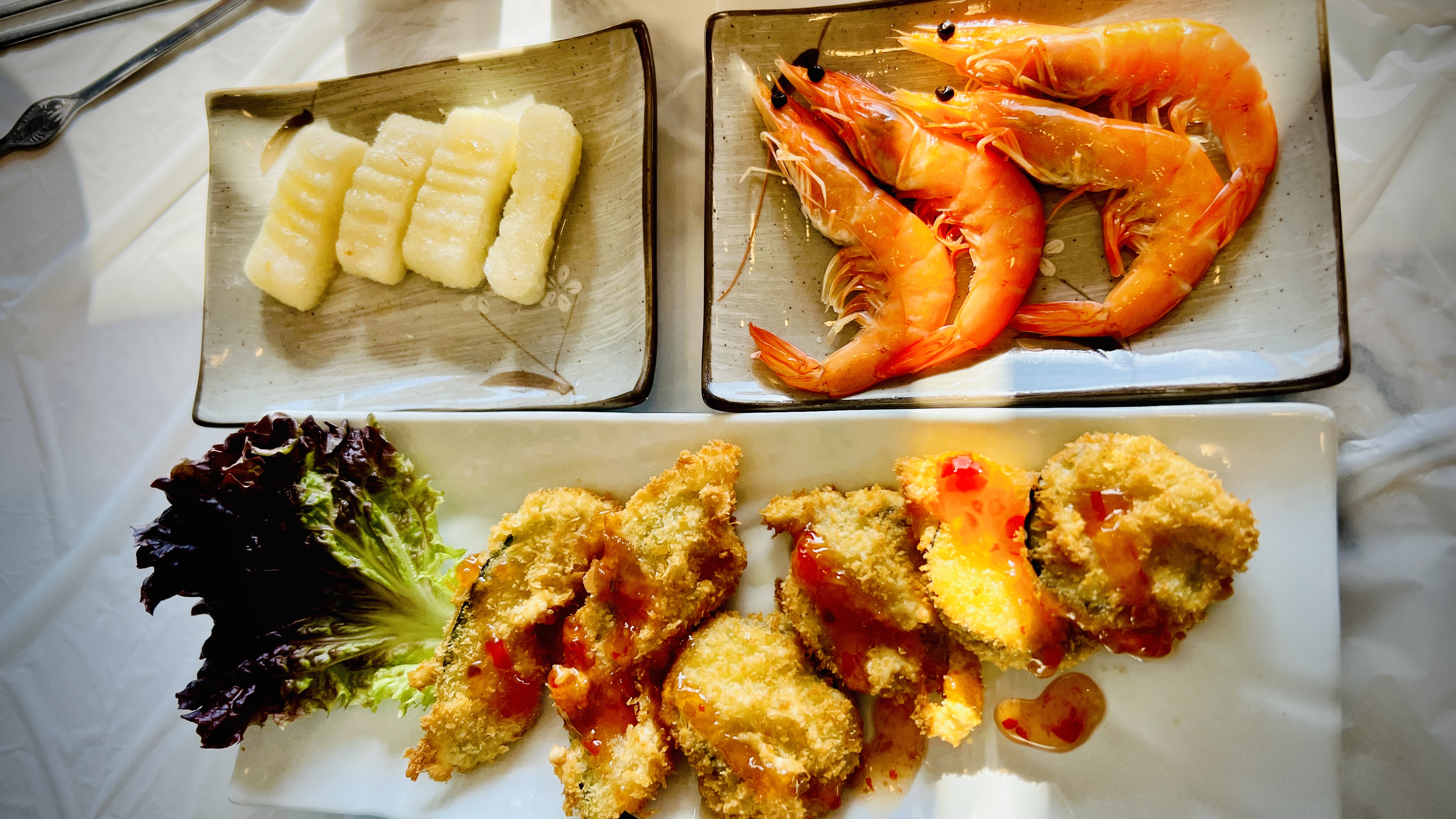 떡구이, 새우, 가지 호박튀김, 오징어 초무침?, 그리고 사전 예약 서비스로 과메기가 나왔다.