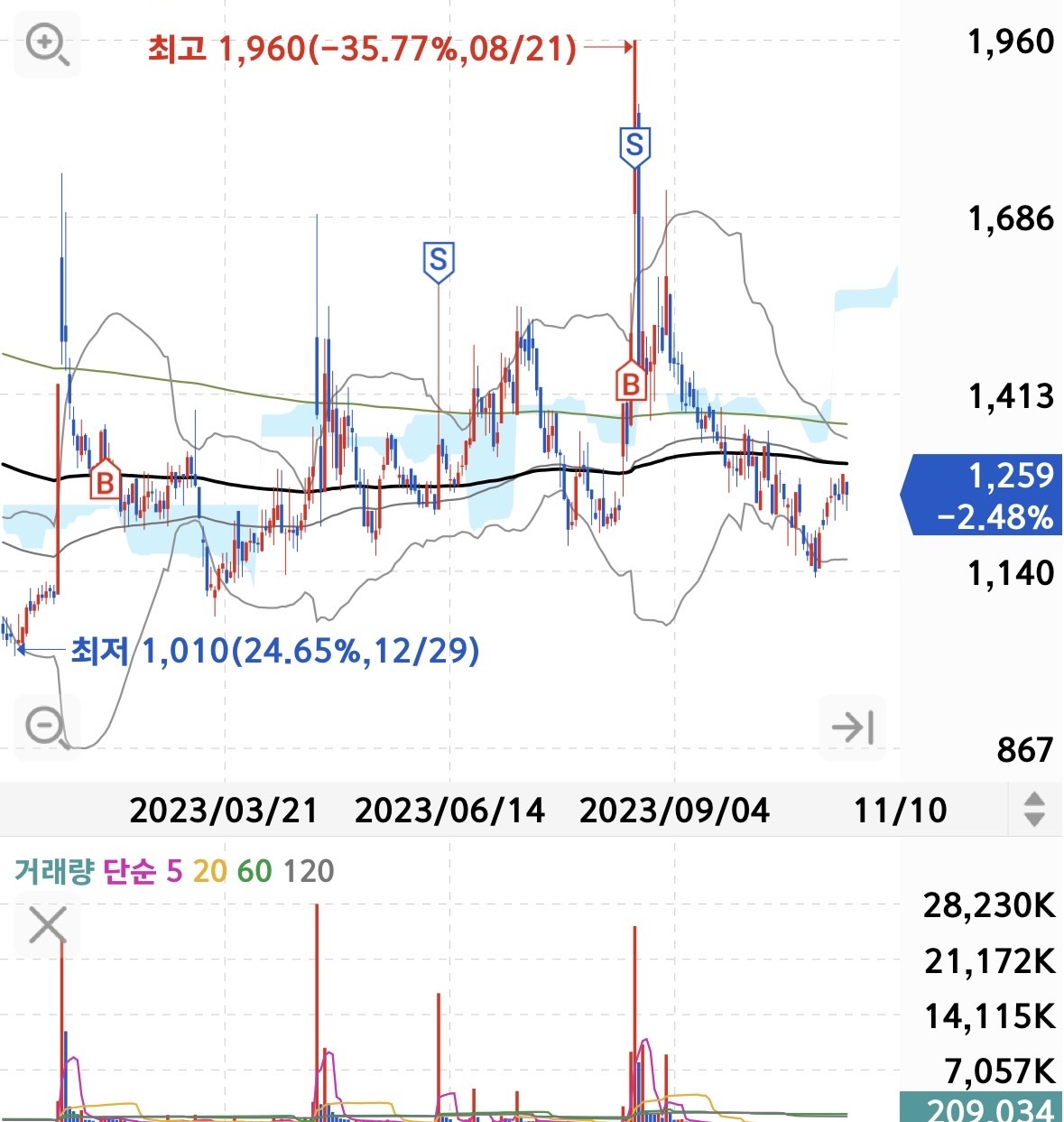 주봉과 거래량은 어마어마 하다. 1차 수익실현 시 전량매도 했지만, 추가로 관심을 가지고 있었고,