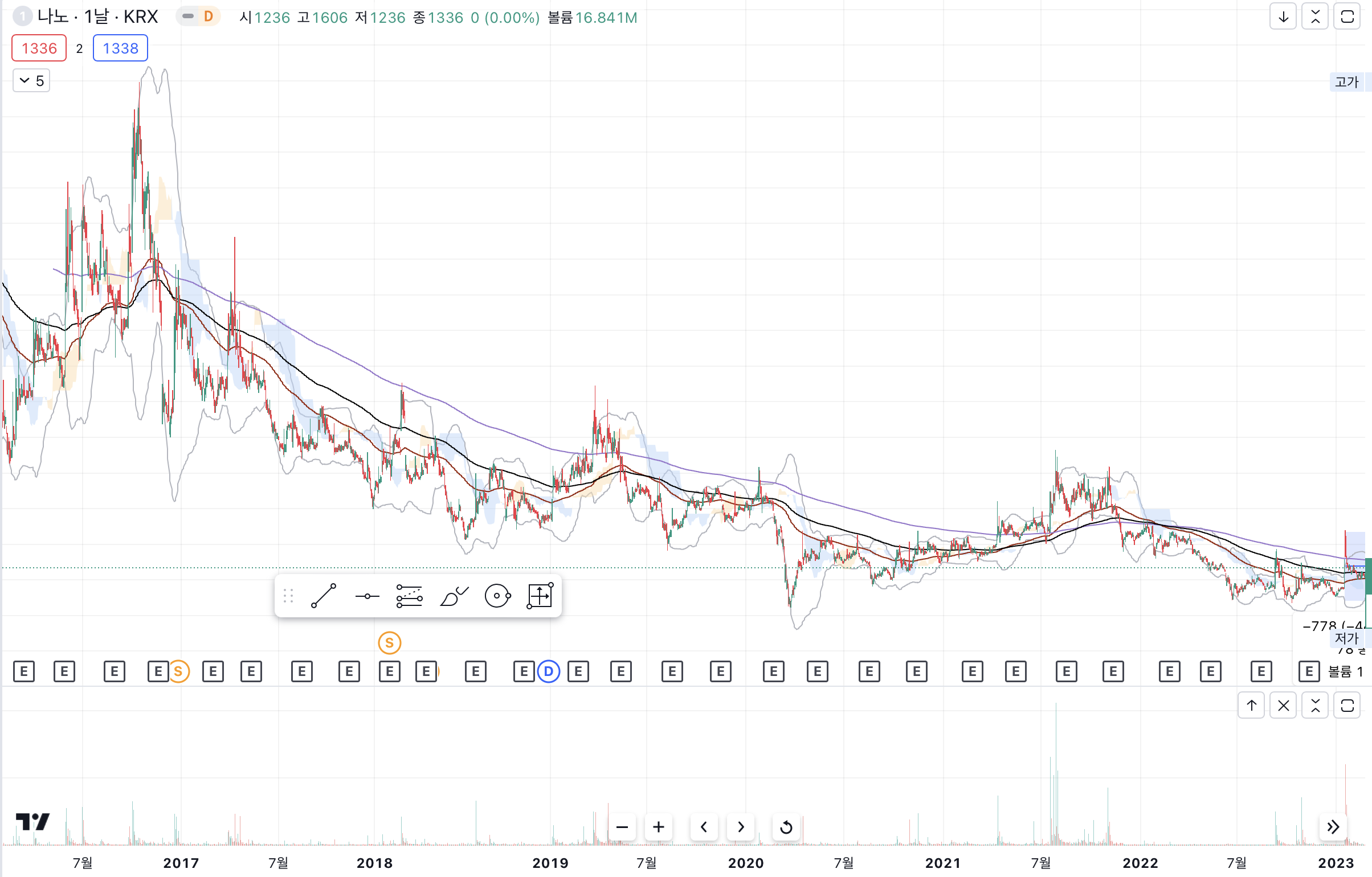 - 지속적인 하락권에서, 거래량과 함께 21년 7월경 바닥을 탈출하려는 모습을 보여준 후, 낮은거래량과 조정이 나옴