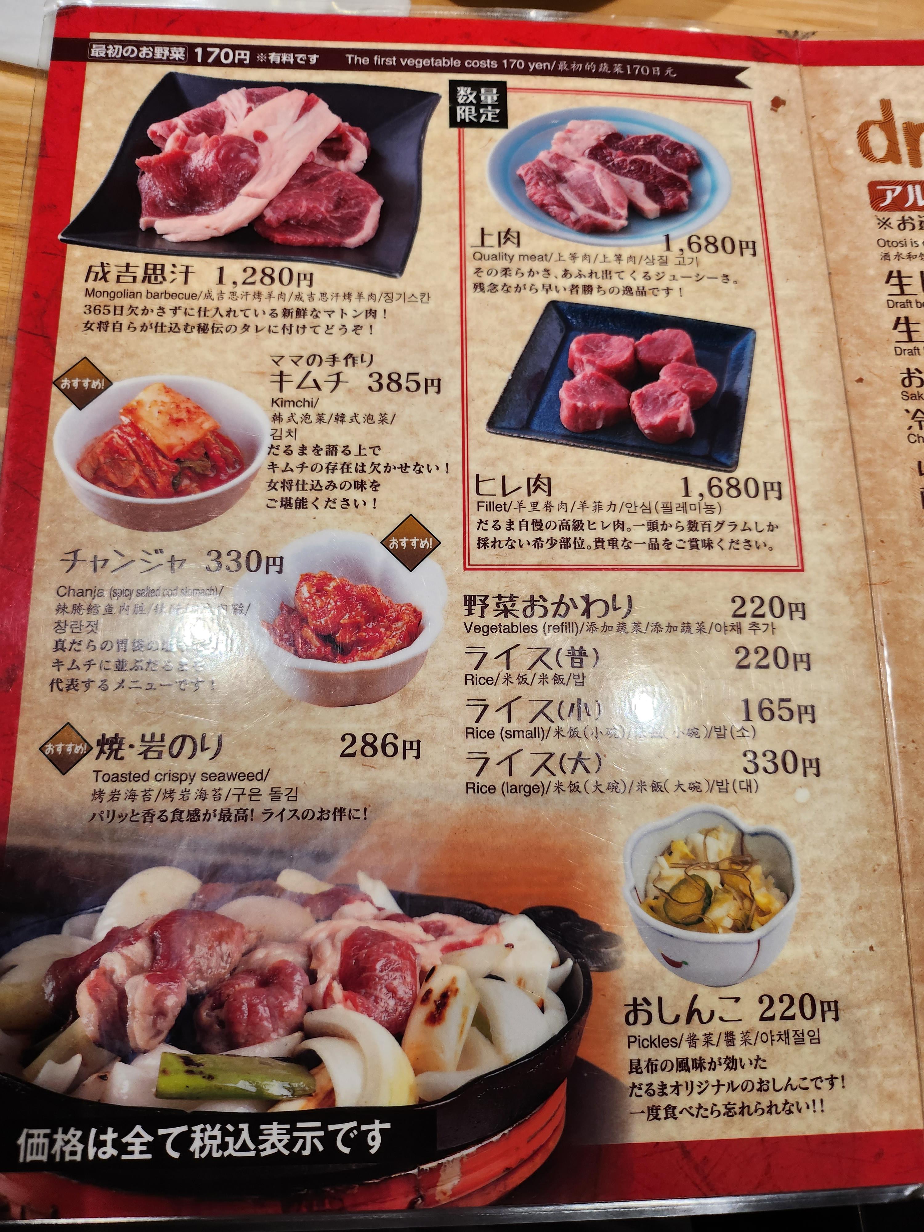 징기스칸을 파는곳은 많지만 예전에 다루마에서 좋은 기억이 있어서 요번엔 6.4점으로 갔습니다.