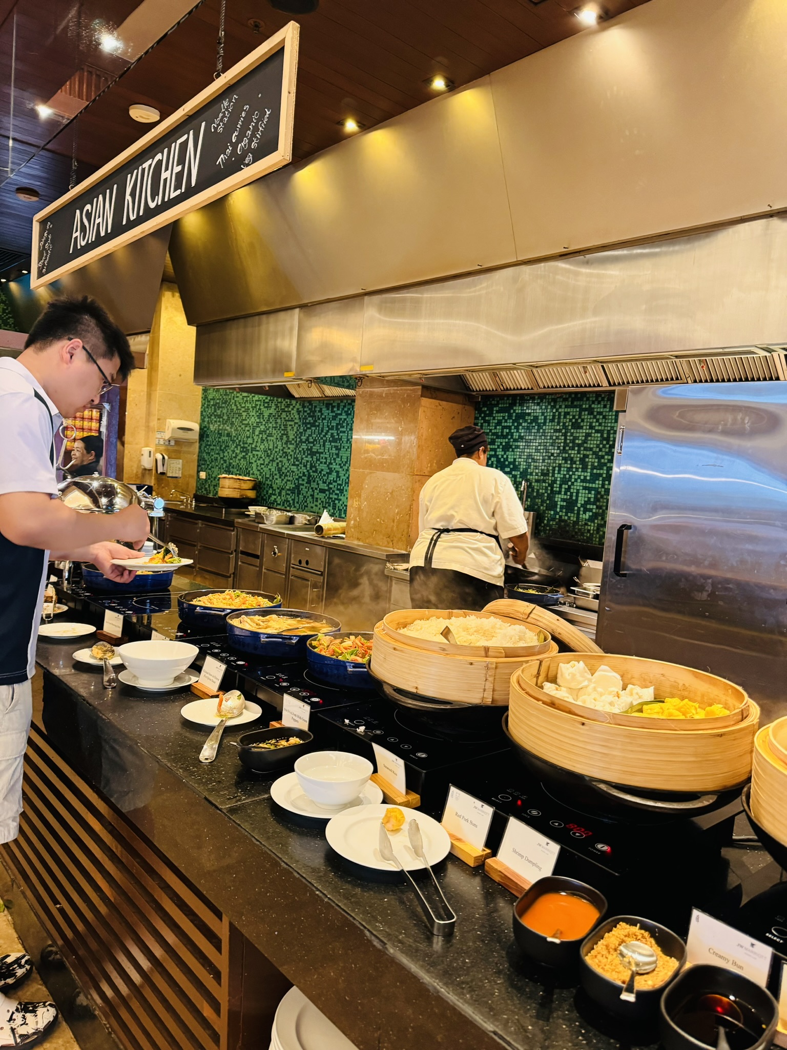 늦게 가면 사람이 매우 많고 애기들이 많아서 시끄럽습니다. 11시까지 아침을 주는데, 느즈막히 할거 다하고 10시쯤 드시러 오시는 분들이 많습니다(아점 해치우기 위해서?) 여기에도 망고를 주는데 맛있습니다!! 아시아키친, 인디아 키친, 에그스테이션 등등 4개 나라의 키친이 있습니다. 커피 머신이 한개라 매우 오래걸리니 미리미리 가야합니다!