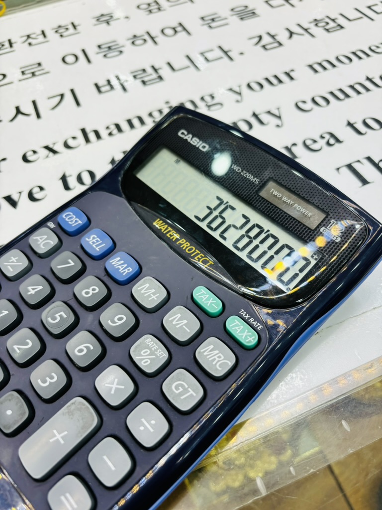 환전소에서 환전, 환전은 역시 계산기. 영어 못해도 좋아요. 5만원권 한화도 됩니다.