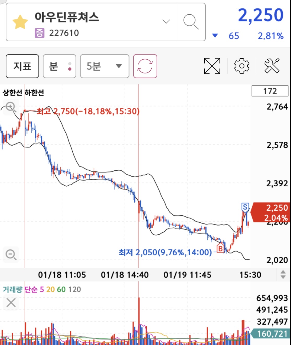 사실 일봉을 보더래도 저렇게 떨어지는 칼날이니, 분봉에서는 별로 볼게 없었습니다. 다만 2050원이라는 일봉상의 지지가 일어날 것이라는 가정을 하고, 볼린저밴드만 가지고 계속 보고 있었습니다. 그러다 볼린저밴드 타고 약하게 떨어지길래 눈 딱감고 매수를 했습니다.