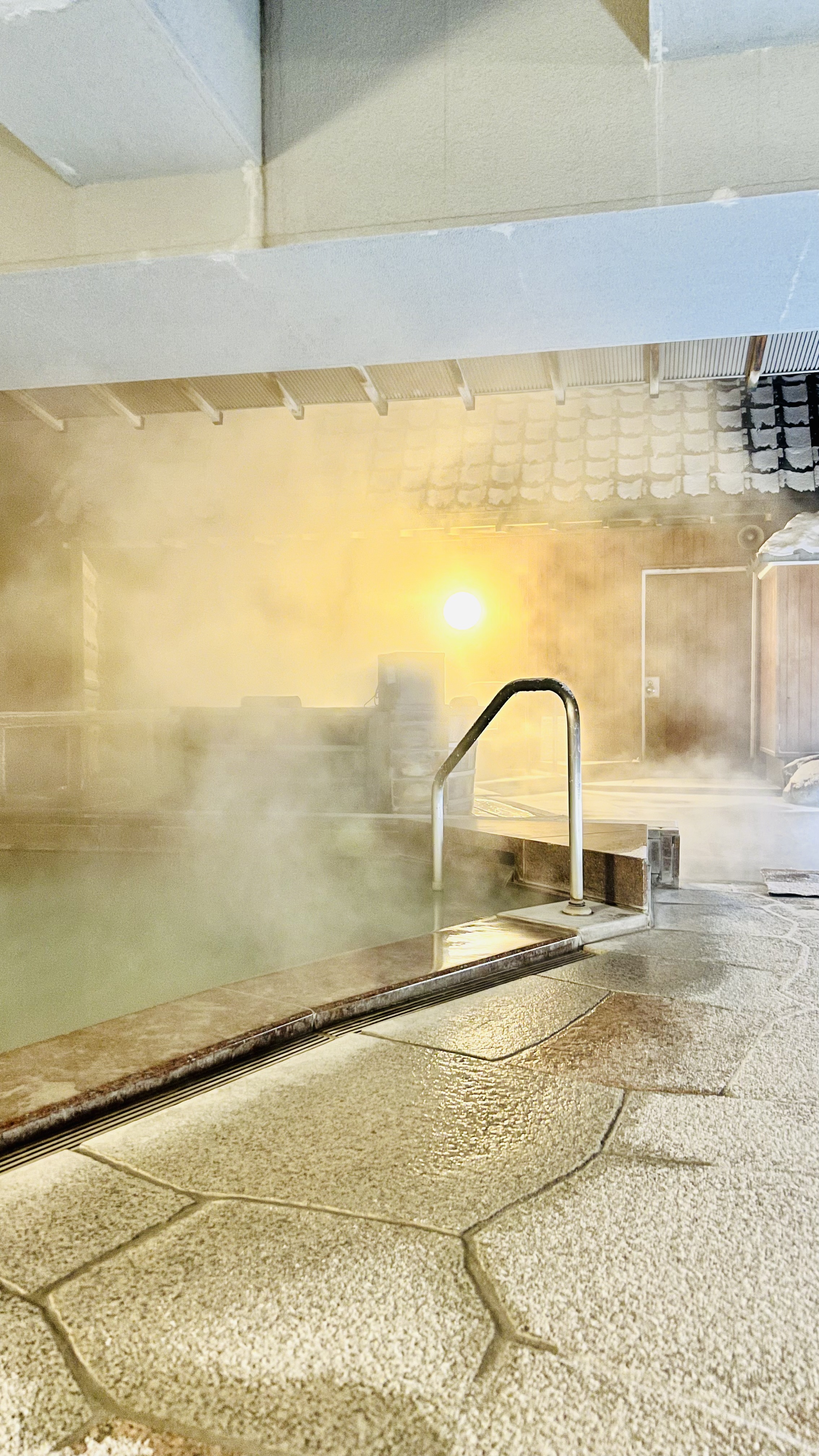 온천은 노천탕과 일반탕이 있으며 각각 위치가 다릅니다. 저녁 식사전에 노천탕을 먼저 방문하기로 하고 이동합니다. 탕안은 한국과 다르게 환기가 되지 않아 뿌옇게 되어있으며 한치앞도 보기가 힘듭니다. 노천탕 끝까지 가면 차가운 공기와 따뜻한 온천물을 즐길 수 있습니다. 물은 밖에 있다보니 상대적으로 차갑지만 그래도 따뜻하고 얼굴을 차가우니 좋습니다.